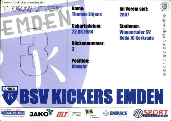 Autogrammkarte Fußballer Thomas Litjens, BSV Kickers Emden, Autogramm