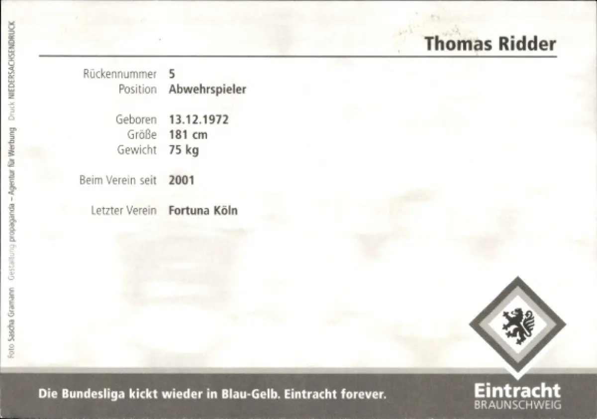 Autogrammkarte Fußballer Thomas Ridder, Eintracht Braunschweig, Autogramm