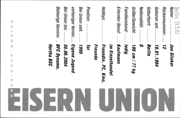 Autogrammkarte Jan Glinker, 1. FC Union, BSR, saller, Autogramm