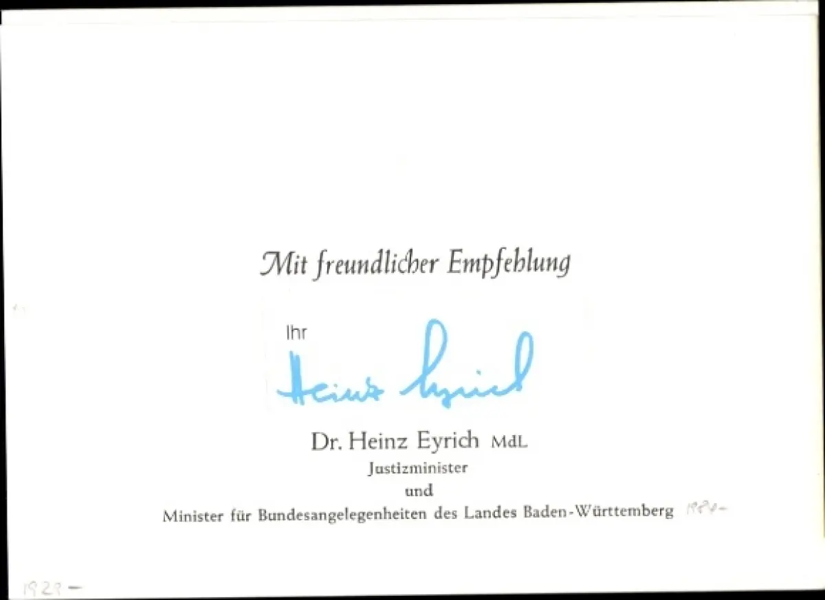 Autogrammkarte Politiker Dr. Heinz Eyrich, Portrait, Autogramm