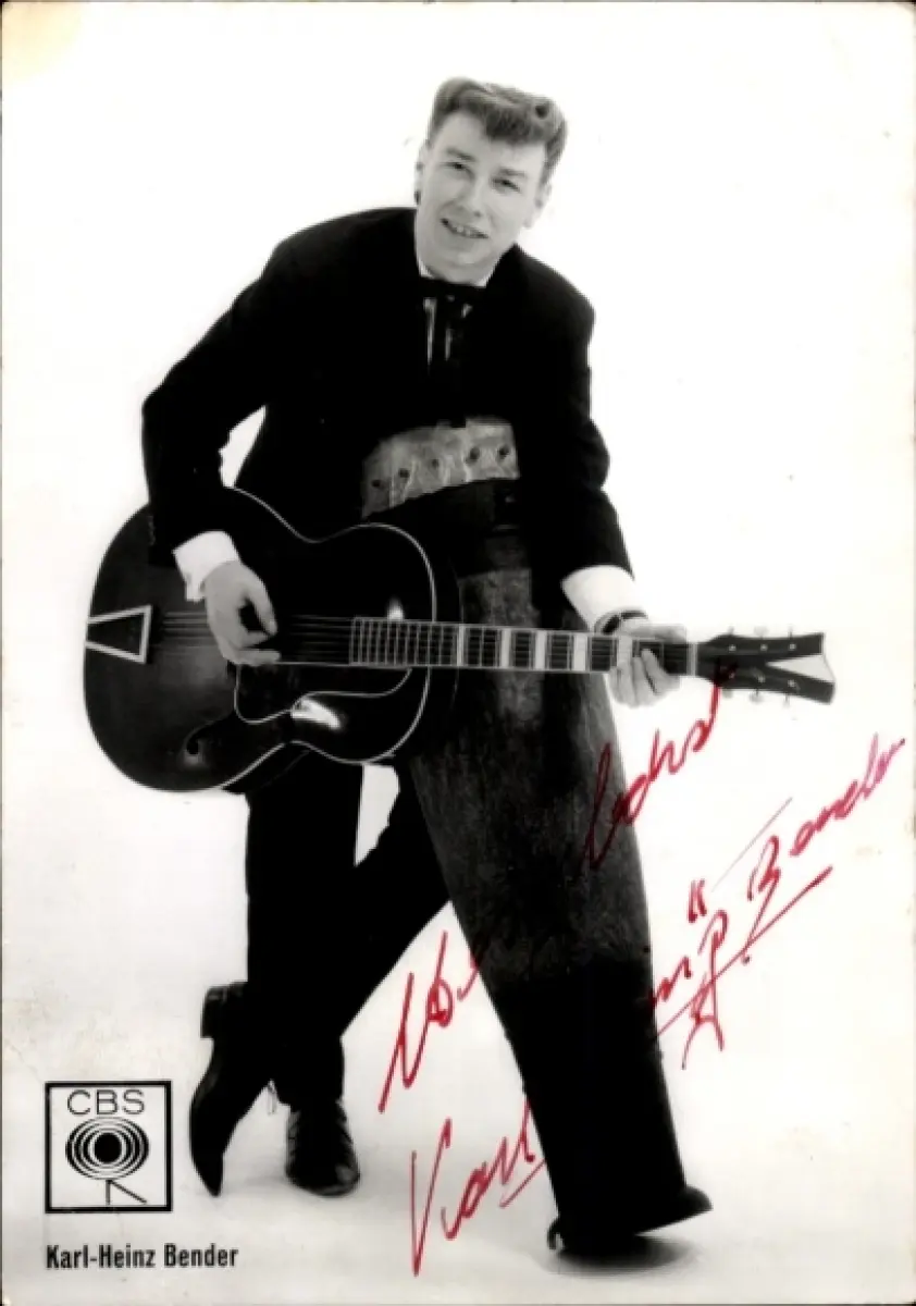 Autogrammkarte Sänger Karl Heinz Bender, Portrait mit Gitarre, Autogramm
