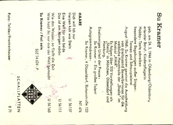 Autogrammkarte Sängerin Su Kramer, Portrait, Telefunken, Autogramm