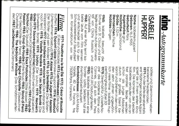 Autogrammkarte Schauspielerin Isabelle Huppert, Portrait, Autogramm