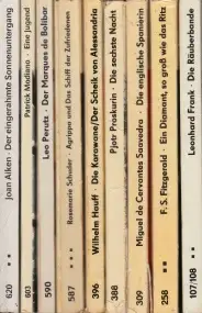 Leonhard Frank; Die Räuberbande; Francis Scott Fitzgerald; Ein Diamant, so groß wie das Ritz; Miguel de Cervantes Saavedra; Die englische Spanierin; Pjotr Proskurin; Die sechste Nacht; Wilhelm Hauff; Die Karawane; Der Scheik von Alessandria und seine Sklaven; Rosemarie Schuder; Agrippa; Das Schiff der Zufriedenen; Leo Perutz; Der Marques de Bolibar; Patrick Modiano; Eine Jugend; Joan Aiken: Der eingerahmte Sonnenuntergang; Geschichten; Erzählungen