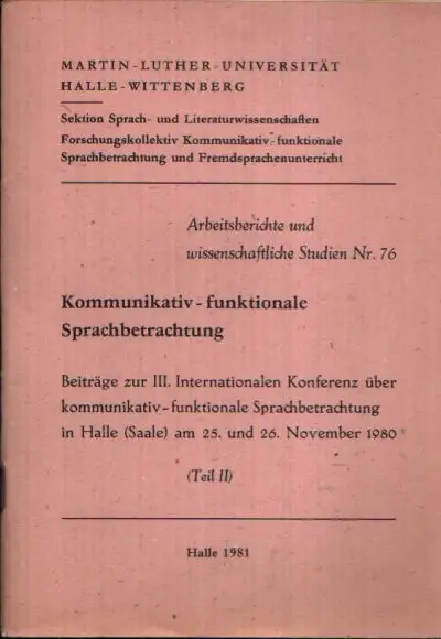 ersten Seiten teils lose, ansonsten in gutem, gebrauchten Zustand, Beiträge zur III. Internationalen Konferenz über kommunikativ-funktionale Sprachbetrachtung in Halle (Saale) am 25. und 26. November 1980. Teil II Beschreibung vom Antiquariat Ardelt 1d7a Antiquariat Ardelt