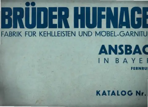 Brüder Hufnagel; Fabrik für Kehlleisten und Möbel-Garnituen; Katalog Nr. 36; Nachschlagewerk; Kehlleisten; Schnitzleisten; Spiral-, Perl- und Paternosterstäbe; Möbelfüße; Füße massiv; Tisch- und Stuhlfüße; Geschweifte Türen; Schnitzerei-Auflagen; Treppenbau; Holzarbeiten; Holzverarbeitung