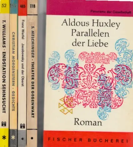 die anderen Bücher sind Erscheinungsjahr 1957, 1961, 1962, 1965, die Sietn sind gebräunt, die Einbände sind teils fleckig, die Einbandkanten sind teils leicht bestoßen, 5 Bücher: Siegfried Melchinger, Theater der Gegenwart - Christian Morgenstern, Gedichte - Huxley, Parallelen der Liebe - Franz Werfel, Jacobowsky und der Oberst - Tennessee Williams, Endstation Sehnsucht; Die Glasmmagerie Beschreibung vom Antiquariat Ardelt 4g5a Antiquariat Ardelt