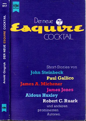 Der neue Esquire Cocktail; Erzählungen; Geschichten; Short-Stories; Aldous Huxley; Kommt Zeit, kommt Rache; Robert C. Ruark; Als ich Gott zum erstenmal begegnete; Anonymus; Ein Mädchen ist entrüstet; William March; Die Schiefertafel; Frank O`Connor; Orpheus und seine Leier; Manuel Komroff; Komparse Nr. 1001; Erskine Caldwell; Augustnachmittag; Andre Maurois; Eine neue Idee für eine Geschichte; T. K. Brown III; Das Tal des Schattens; Gerald Kersh; Zehn alte Löwen; John Steinbeck; Einsame Nachtwache; Paul Gallico; Das Turnier der Magier; Frank Scully; Das Liebchen aus Montana; H. L. Mencken; Ein Revolutionär stürzt; Ray Bradbury; Der Illustrierte Mensch; Frederick Hazlitt Brennan; Das Golfspiel und der Irrenarzt; James Jones; Zwei Beine für uns beide - James A. Michener; Der fehlende Tropfen; John Novotny; Der Whisky-See; Max Shulman; Hier wird spanisch gesprochen