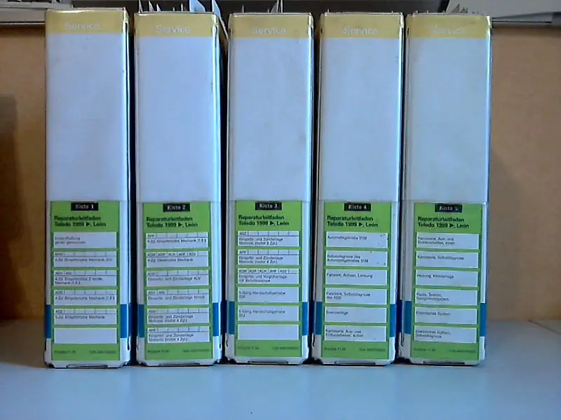 die Ordner stammt aus einer Werkstattauflösung, der Ordner, die Seiten und die Kisten sind stark fleckig, aus dem Inhalt: KISTE 1: Wartung bis ins Detail Ausgabe 11.99 - 4-Zyl. Einspritzmotor (4V), Mechanik Ausgabe 12.99 - 4-Zyl. Einspritzmotor Mechanik (1,6 L-Motor) Ausgabe 10.98 - 5-Zyl. Einspritzmotor, Mechanik, Ausgabe 10.98 - KISTE 2: 4-Zyl. Einspritzmotor, Mechanik (1,8 I-Motor) Ausgabe 11.99 - 4-Zyl. Dieselmotor, Mechanik, Ausgabe 11.99 - Simos Einspritz- und Zündanlage Ausgabe 10.98 - Motronic Einspritz- und Zündanlage (4-Zyl. Motor), Ausgabe 11.99 - 4-Zyl. Einspritzmotor, Mechanik (1,8 l-Motor), Ausgabe 10.98 - Motronic Einpritz- und Zündanlage (4-Zyl. Motor), Ausgabe 10.98 - KISTE 3: Motronic Einspritz- und Zündanlage (4-Zyl. Motor), Ausgabe 11.99 - Motronic Einspritz- und Zündanlage (5-Zyl. Motor) Ausgabe 10.98 - Einspritz- und Vorglühanlage mi Verteilerpumpe, Ausgabe 11.99 - 5-Gang Handschaltgetriebe 02K Ausgabe 10.98 - 5 Gang-Schaltgetriebe 02J Ausgabe 10.98 - KISTE 4: Selbstdiagnose des Automatikgetriebe 01 M Ausgabe 10.98 - Fahrwerk, Achsen, Lenkung Front- und Allradantrieb Ausgabe 05.00 - Fahrwerk Eigendiagnose für ABS Ausgabe 05.00 - Bremsanlagen Ausgabe 05.00 - Heft Karosserie, Montagearbeiten, Außen Auflage 11.99.- KISTE 5: Karosserie, Montagearbeiten Innen Ausgabe 11.99 - Karosserie, Eigendiagnost Ausgabe 11.99 - Heizung Klimaanlage AUflage 10.98 - Radio, Telefon, Navigationssystem Auflage 11.99 - Elktrisches System Ausgabe 11.99 - Elektrisches System, Selbstdiagnose Ausgabe 11.99 Beschreibung vom Antiquariat Ardelt 1p2a Antiquariat Ardelt