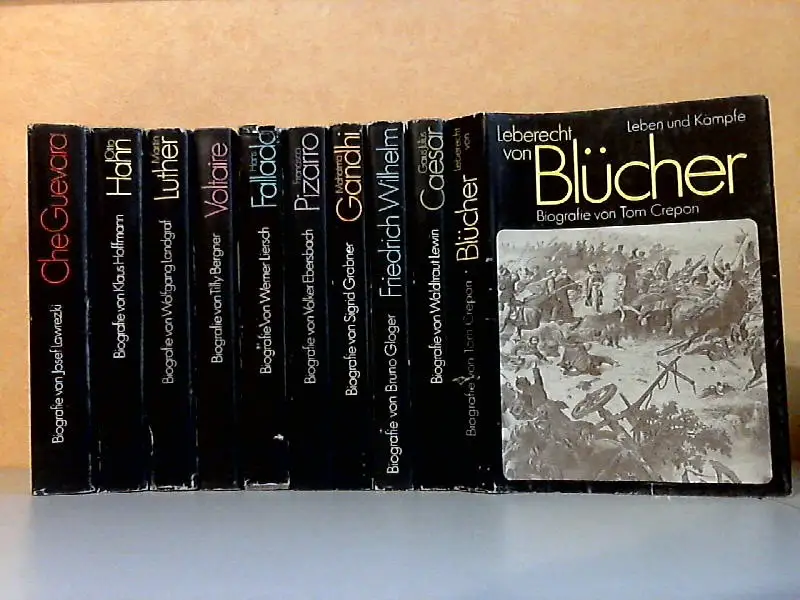 alle 10 Bücher haben einen Eigentumsstempel, die Umschlagkanten sind bestoßen, die Bücher sind altersbedingt in einem guten Zuastand, Alle 10 Bücher sind Biografien berühmter Persönlichkeiten. Ernesto Che Guevara von Josef Lawrezki - Otto Hahn, Stationen aus dem Leben eines Atomforschers von Klaus Hoffmann - Martin Luther, Reformator und Rebell von Wolfgang Landgraf - Voltaire, Leben und Werk eines streitbaren Denkers von Tilly Bergner - Hans Fallada, Sein großes kleines Leben von Werner Liersch - Francisco Pizarro, Glanz und Elend eines Conquistadors von Volker Ebersbach - Mahatma Gandhi, Politiker, Pilger und Prophet von Sigrid Grabner - Friedrich Wilhelm, Kurfürst von Brandenburg von Bruno Ciloger - Gaius Julius Caesar, Autstieg und Fall eines römischen Politikers von Waldtraut Lewin - Leberecht von Blücher, Leben und Kämpfe von Tom Crepon Beschreibung vom Antiquariat Ardelt 3g6b ISBN-Nummer: 3355006246 Antiquariat Ardelt