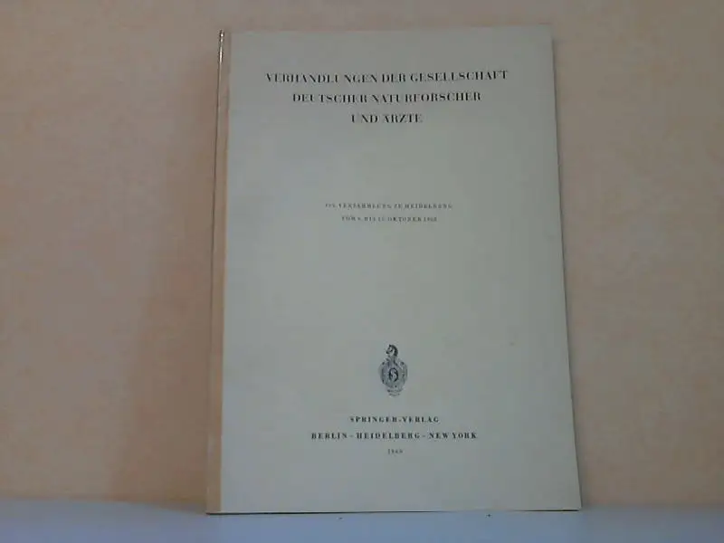 das Büchlein stammt aus einer Haushaltsauflösung, gebräunt, fleckig, Einbandkanten mit Bestoßungen, aus dem Inhalt: I. Allgemeiner Bericht über die 105. Versammlung in Heidelberg: Ansprache von Prof. B. Timm - Ansprache des Bundesministers für Gesundheitswesen Käte Strobel - Ansprache des Kultusministers des Landes Baden-Württemberg Prof. D. Dr. W. Hahn - Ansprache von S. Magnifizenz Prof. K. Baldinger - Ansprache von S. Magnifizenz Prof. Th. v. d. Wense - Ansprache von Prof. O. Kratky - Niederschrift über die Geschäftssitzung der 105- Versammlung. II. Aus den wissenschaftlichen Sitzungen: Hochenergiebeschleuniger und Physik der Elementarteilchen. Von A. Citron - Die Rolle der Blasenkammer bei der Entdeckung neuer Elementarteilchen. Von H. Filthuth - Die Elementarteilchen und ihre Wechselwirkungskräfte. Von H. Pietschmann - Erforschung des interplanetaren Staubes durch astronomische Beobachtungen des Zodiakallichtes und mittels Weltraumsonden. Von H. Elsässer - Struktur und Alter der Meteorite. Von W. Gentner - Chemische Vorgänge während der Entstehung des Planetensystems. Von E. Anders 1 - Die Entsalzung des Meerwassers. Ein Problem der Wissenschaft und der Weltwirtschaft. Bewässerungs¬ Probleme der Negev-Wüste in Israel. Von M. R. Bloch - Struktur und Wirkungsweise der Antikörper. Von F. Haurowitz - Die molekularen Grundlagen der Antikörperbildung. Von N. Hilschmann 1", - Antigens and Antigenicity. By M. Sela. Der Arzt vor der Frage von Leben und Tod. Von H. Schadewaldt - Die Regulation der Immunantwort. Von G. J. V. Nossal - Mechanismen der krankheitserregenden Immunphänomene des Menschen. Von C. Steffen - Krankheiten als Folge der Selbstverkennung und Selbstzersetzung von Geweben. Von F. Hartmann - Organtransplantation-Grundlagen. Von R. Pichlmayr - Immunologische Aspekte des Alterns. Von R. L. Walford - Einige aktuelle Probleme der Blutgruppenkunde (Die Protectine). Von O. Prokop. Celluläre Aspekte der Antikörpersynthese. Von B. Pernis - Die Immunfabrik. Von H. Fischer, gemeinsam mit W. Ax und H. Malchow - Die Evolution des Immunapparates. Von D. Hammer - Organtransplantationen, Klinik. Von H. Pichlmaier - Organtransplantationen, ethisch-rechtliche Probleme. Von R. Zenker. Antibiotica als Hemmstoffe der Nucleinsäure- und Proteinsynthese. Von G. Hartmann, W. Behr, - Beissner, K. Honikel und A. Sippel Beschreibung vom Antiquariat Ardelt 1h1b Antiquariat Ardelt
