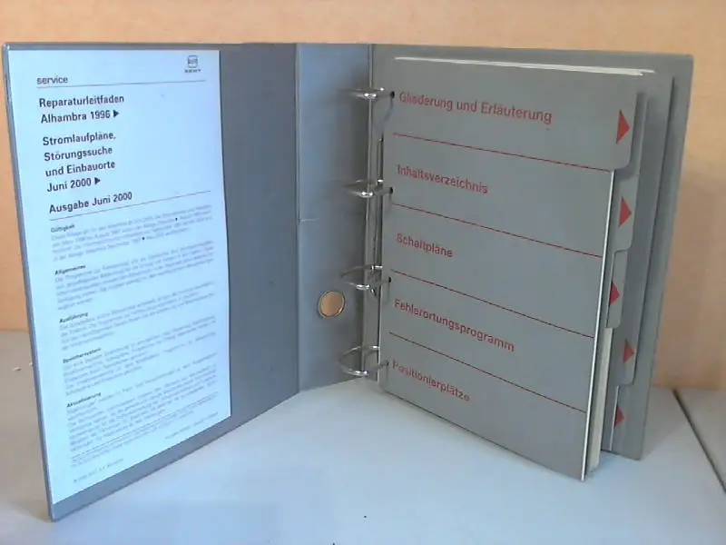 der Ordner stammt aus einer Werkstattauflösung, der Ordner und die Seiten sind stärker fleckig, , aus dem Inhalt: STROMLAUFPLÄNE: Grundausstattung, ab Mai 2000 - 1,8 - Motronic/IIO kW, Motorkennbuchstaben AWC, ab Mai 2000 - 2,0 - Motronic/85 kW, Motorkennbuchstaben ATM, ab Mal 2000 - 2,8 - Motronic/150 kW, Motorkennbuchstaben AYL, ab Mai 2000 - 1,91 - Turbodiesel mit Pumpe-Düse-Einhelt/66 kW, Motorkennbuchstaben ANU, - 1,9 I - Turbodiesel mit Pumpe-Düse-Einheit/85 kW, Motorkennbuchstaben AUY, ab Mai 2000 - Antiblockiersystem (ABS), ab Mai 2000 - Antiblockiersystem (ABS) mit elektronischer Differentialsperre (EDS), Antischlupfregelung (ASR) una elektronischem Stabilitätsprogramm (ESP), ab Mai 2000 Airbagsysteme, ab Mai 2000 - Klimaanlage (Fahrzeuge mit Benzinmotor), ab Mai 2000 - Klimaanlage (Fahrzeuge mit Dieselmotor), ab Mai 2000 - Climatronic (Fahrzeuge mit Benzinmotor). ab Mai 2000 - Climatronic (Fahrzeuge mit Dieselmotor), ab Mai 2000 - Zentralverriegelung/Zentralverriegelung mit Funkvernbedienung und Diebstahlwarnanlage, ab Mai 2000 - elektrische Fensterbetätigung - Schiebe-ZAusstelldach, Digitaluhr, ab Mai 2000 - `Suchprogramm Beschreibung vom Antiquariat Ardelt 1p1b Antiquariat Ardelt