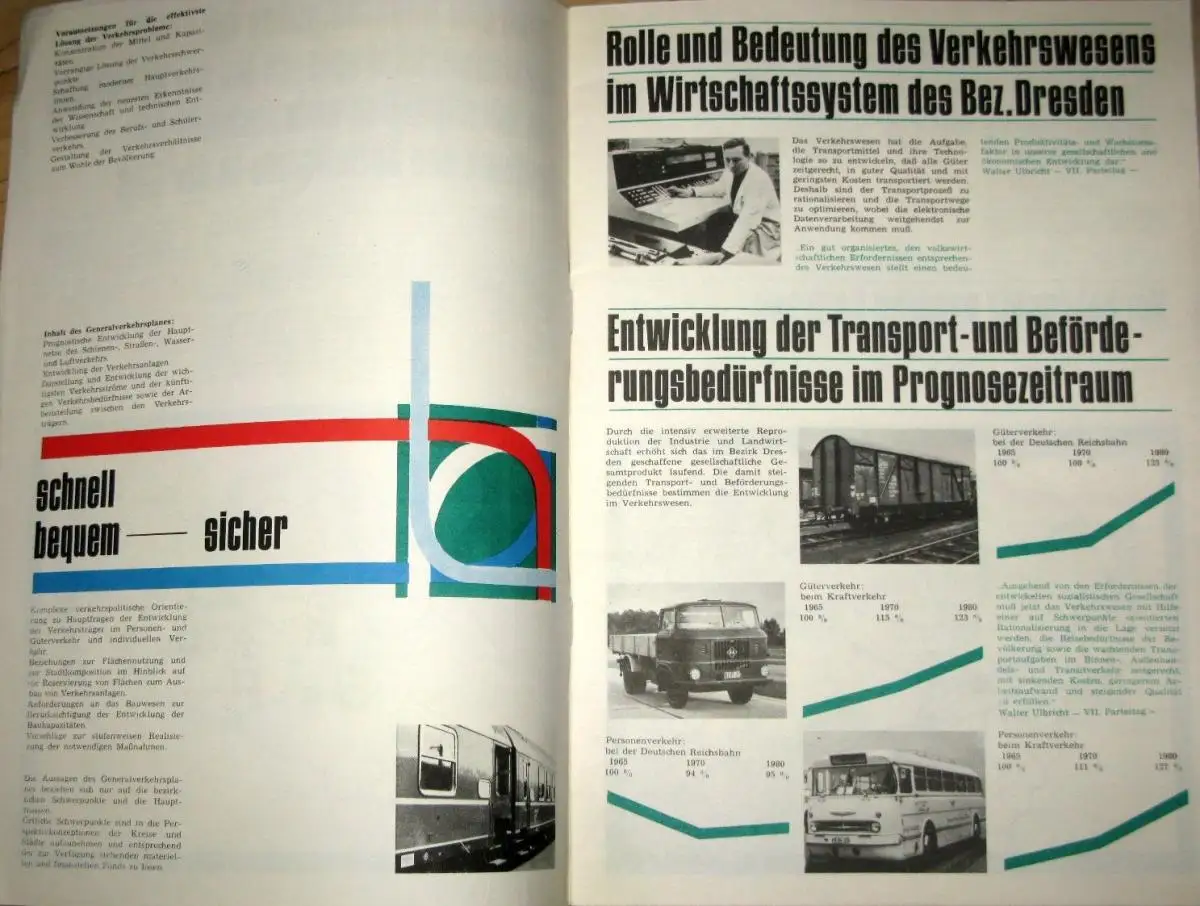 sehr guter Zustand, geringe Gebrauchs- und Alterungsspuren: rechts oben teils leicht eselsohrig, Inhalt und Hauptaufgaben des Generalverkehrsplanes bei der Gestaltung des entwickelten gesellschaftlichen Systems des Sozialismus in der DDR - Rolle und Bedeutung des Verkehrswesens im Wirtschaftssystem des Bez. Dresden - Entwicklung der Transport- und Beförderungsbedürfnisse im Prognosezeitraum (bis 1980) - Verkehrsnetz unseres Bezirkes - Zusammenarbeit und Arbeitsteilung der Verkehrsträger - Gestaltung des Berufsverkehrs in den Hauptzentren unseres Bezirkes - Verkehrsträgerwechsel - Stückgut- und Wagenladungsknoten - Rationalisierungsmaßnahmen bei der Deutschen Reichsbahn - Entwicklung der Leistungen des Kraftverkehrs - Rationalisierungsmaßnahmen des Kraftverkehrs - Das Straßennetz des Bezirkes und sein Ausbau entsprechend dem wachsenden Verkehrsaufkommens - Luftverkehr - Binnenschiffahrt - Verkehrsverbindungen zu den Erholungsgebieten unseres Bezirkes, Softcover, ca. 21 x 30, 24 Seiten mit einigen Bildern, Skizzen und Karten