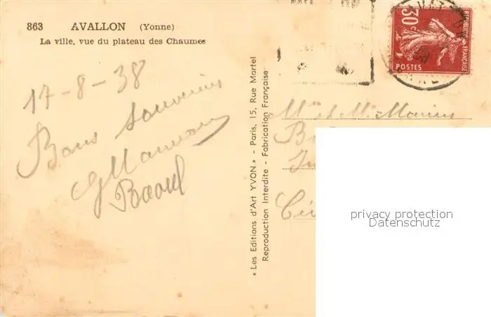 Avallon La ville vue du plateau des Chaumes Avallon postalisch gelaufen 1938 Erhaltung siehe scans [WerneD78] WernPID7
