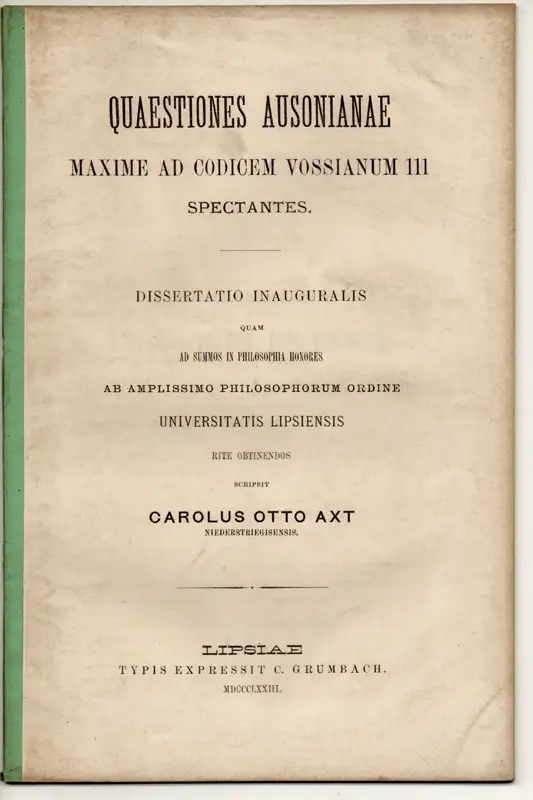 Axt, Karl Otto: Quaestiones Ausonianae maxime ad codicem Vossianum III spectantes. Dissertation.