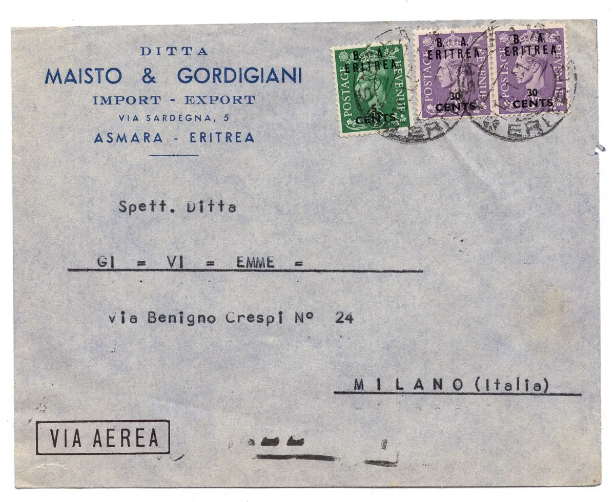 Umschlag - B. A. Eritrea - Briefumschlag auf dem Luftweg von Asmara nach Mailand am 17.1.51 frankiert mit 5 Nr. 14 + Paar von 30 c. Nr. 18 - Annullierung der Ankunft in Mailand 19.1.51 - Selten - Kat. euro 425 Cod. 2821/WEB