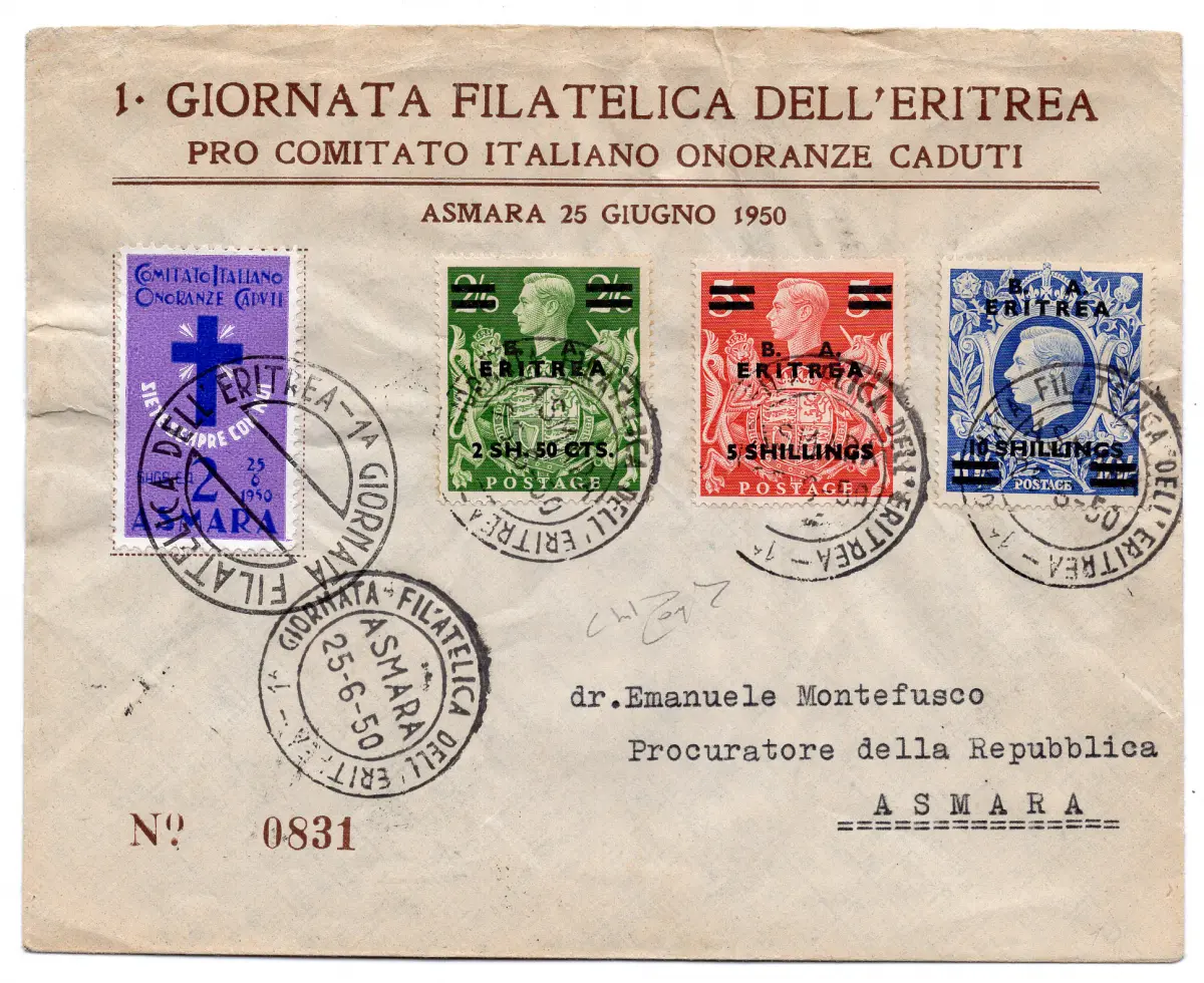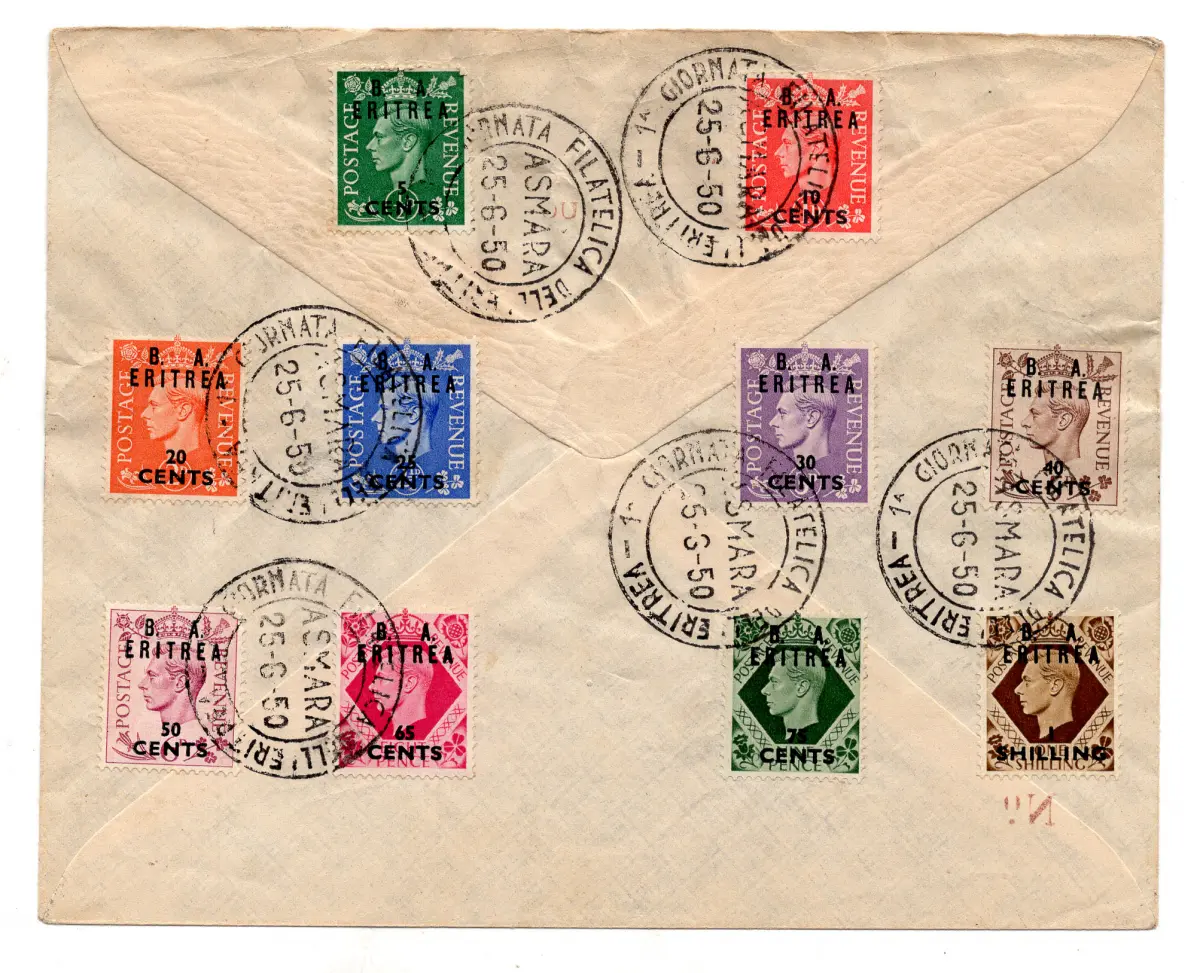 B. A. Eritrea - Sonderumschlag zum I. Philatelietag mit Erinnophil - B. A. Eritrea - Sonderumschlag zum I. Philatelietag mit frankierter Erinnerung mit kompletter Serie Nr. 14/26 - Ann. spezielle Asmara 25.6.50 - Die niedrigen Werte der Serie befinden sich auf der Rückseite des Umschlags - Sehr schön durch das Vorhandensein der drei hohen Werte (trikolore Frankatur) - Ray. Code 979/11