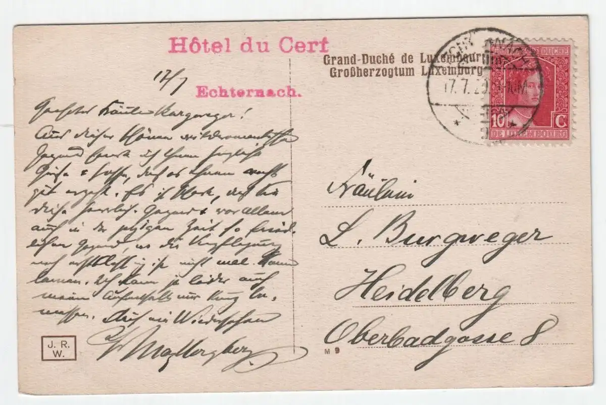 B. Petite Suisse Luxembourgeoise Kleine Luxemburger Schweiz Roitzbach Ley bei Berdorf. Original, keine Kopie.Zustand und Jahr: siehe Scan.Alter: Zwischenkriegszeit (1918-1939) . Jahr: 1920Gelaufen: ja (Versandt)Stadt & Region: BerdorfMotiv: RomantikThema: Blumen & Pflanzen Portokosten: 4 EURO (eingeschriebener Briefversand). Versand von Polen nach Deutschland: 3-6 werktage. Kombinierter Versand mit viele Artikel - meist 4 EURO. ================================================ The item is original.Please carefully look at photos to check condition.Period: Inter-War (1918-1939) . Year: 1920Circulated: yes (posted)City & region: BerdorfCharacteristic, topic: RomanceSubject: Flowers & PlantsShipping and postage costs: 4 EURO (for registered mail). Combined package with many items - usually 4 EURO.
