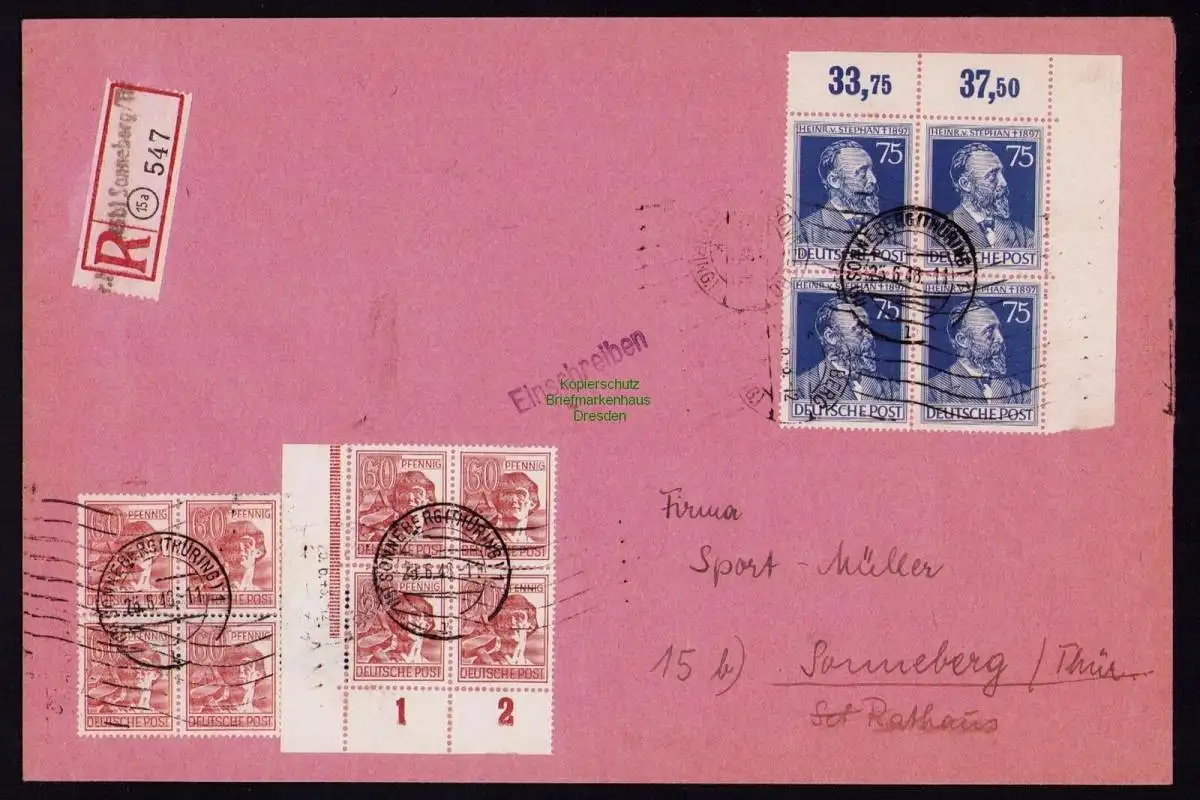 B19081 Brief Einschreiben SBZ Währungsreform 1948 Sonneberg R 547 30.7.48 Zehnfach MiF Stephan / AS Viererblöcke Format 24 x 16 cm