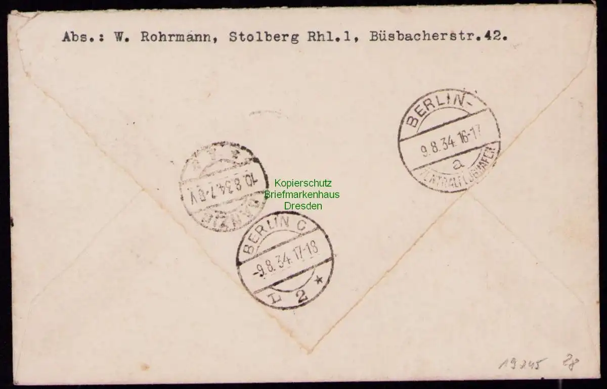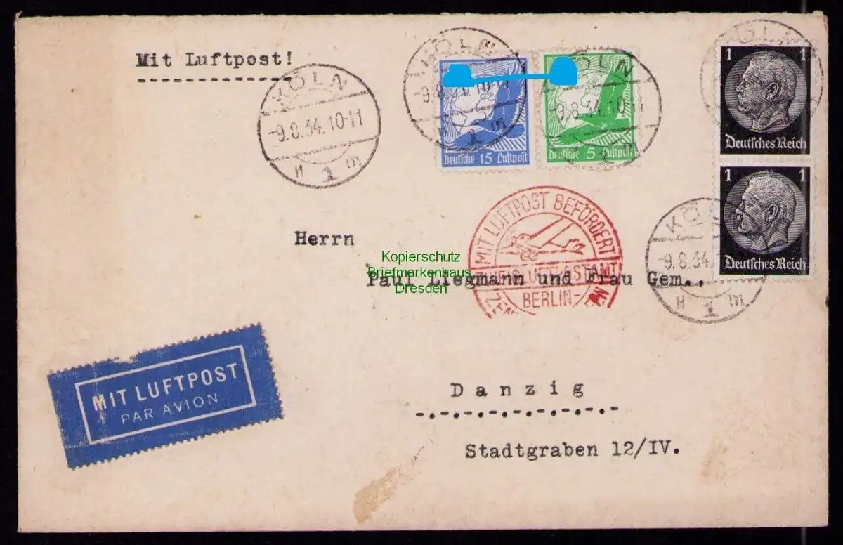 B19245 DR Brief Deutsches Reich Köln 1934 mit Luftpost über Berlin nach Danzig