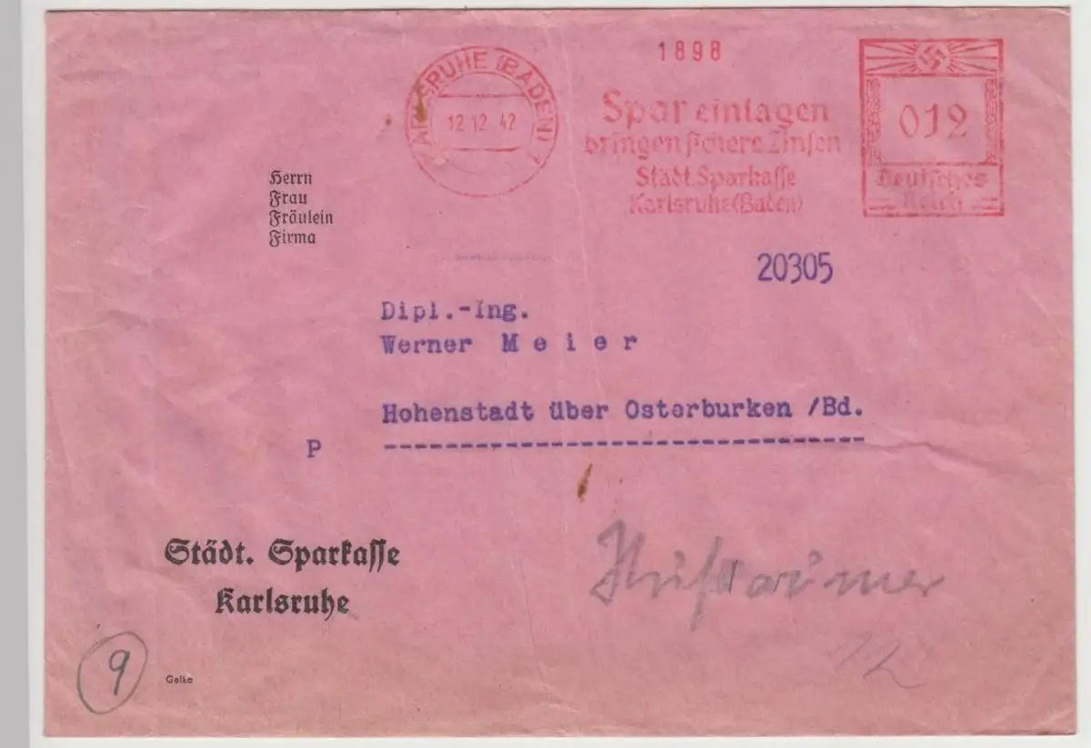 (B2119) Bedarfsbrief Deutsches Reich, Freistempel Karlsruhe 1 1942
