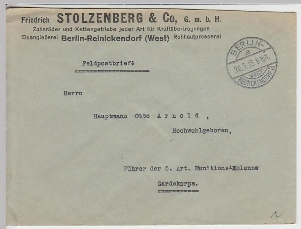 (B380) Bedarfsbrief DR Feldpost 1915, Firmenumschlag Fr. Stolzenberg & Co Berlin