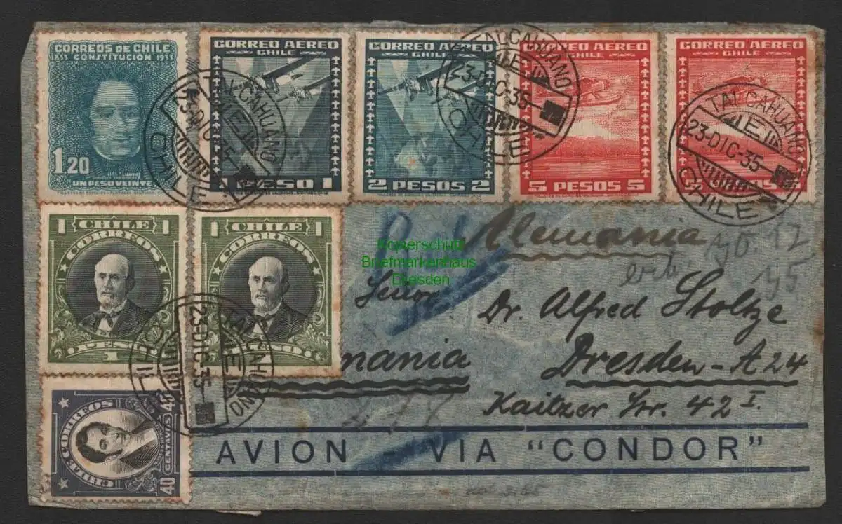 B8948 Brief Chile Talcahuano 1935 Avion via Condor Dresden Zollamtlich geöffnet