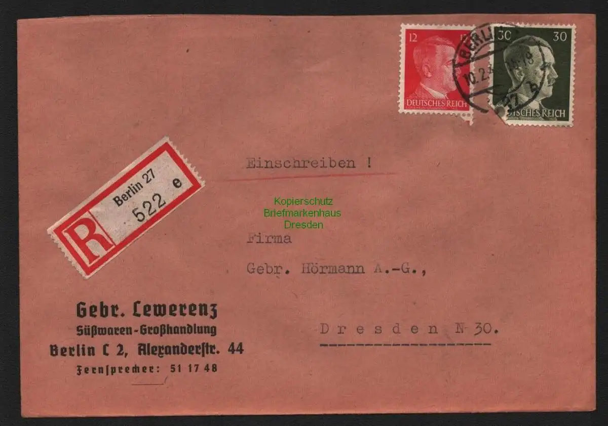 R-Brief an Gebr. Hörmann A.-G. Deutschlands größte Waffelfabrik Dresden N 30 Dresden Mickten Mischfrankatur Hitler Firma Süßwaren-Großhandlung