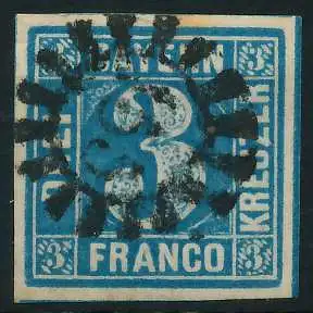 3 Kr blau, Freimarke, Wertziffer im Viereck (Quadratausgabe), geschlossener Mühlradstempel Nr. 155, I=Kempten 2 Sc 3.- / II=Germersheim Pf 15.- nach Sem, rückseitig sauber