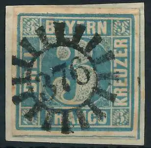 3 Kr blau, Freimarke, Wertziffer im Viereck (Quadratausgabe), geschlossener Mühlradstempel Nr. 376, I=Weiden Ob 5.- / II=Osterhofen Nd 11.- nach Sem