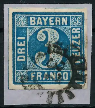 3 Kr blau, Freimarke, Wertziffer im Viereck (Quadratausgabe), geschlossener Mühlradstempel Nr. 37, I=Buchloe Sc 15.- / II=Bayreuth Of 2.- nach Sem