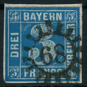 3 Kr blau, Freimarke, Wertziffer im Viereck (Quadratausgabe), geschlossener Mühlradstempel Nr. 68, I=Eichendorf Nd 13.- / II=Burgkundstadt Of 8.- nach Sem, rückseitig sauber, schmalrandig