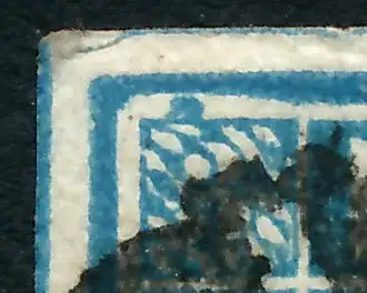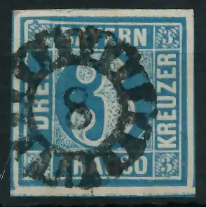 3 Kr blau, Freimarke, Wertziffer im Viereck (Quadratausgabe), geschlossener Mühlradstempel Nr. 8, I=Amberg Op 5.- / II=Albertsweiler Pf 50.- nach Sem, rückseitig sauber, oben links über Ziffernquadrat Besonderheit