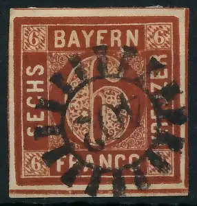 6 Kr braun, Freimarke, Wertziffer im Viereck (Quadratausgabe), geschlossener Mühlradstempel Nr. 402, I=Zwiesel Nd 10.- / II=Pliening Ob 40.- oder Schliersee Ob 40.- nach Sem, rückseitig ablösbarar Falzrest
