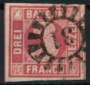 3 Kr rot, Freimarke, Wertziffer im Viereck (Quadratausgabe), geschlossener Mühlradstempel Nr. 31, II=Baiersdorf Mf 15.- nach Sem, rückseitig sauber, im rechten Rand Papierbruch
