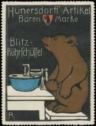 Bären-Marke, Blitz-Rührschüssel, Hünersdorff-Artikel, Buchstabe R, Braunbär, Bär, Größe/Zustand: 6x7 , leicht fleckig, Original alte Reklamemarke die seinerzeit für die Werbung benutzt wurde