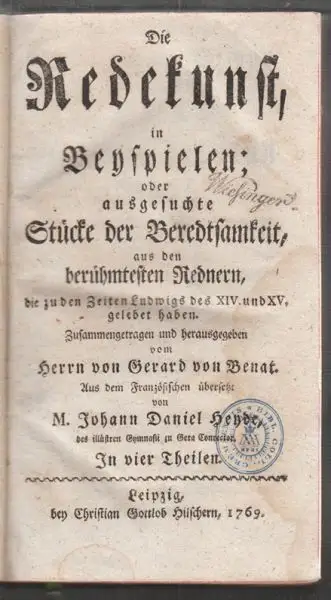 Lpz., Hilscher 1769. 1. u. 2. Bd. (von 4) in 1 geb. gr.-8°. (24) 260 (20); Tit., 358 (32) S. Ldr. d. Zt. Mit Rückensch. u. Rückengoldpräg. Anfangs wasserrand., sonst in gutem Zustand.