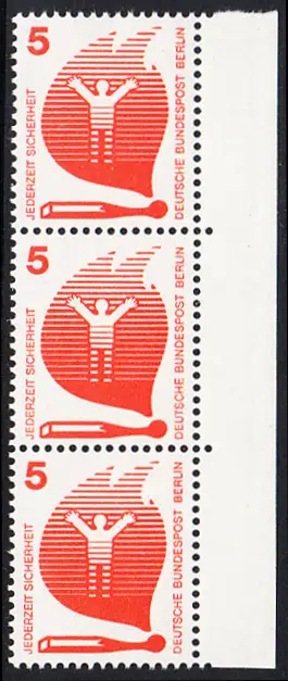BERLIN 1971 Michel-Nummer 402 postfrisch vert.STRIP(3) RAND rechts - Unfallverhütung: Brand durch Streichholz