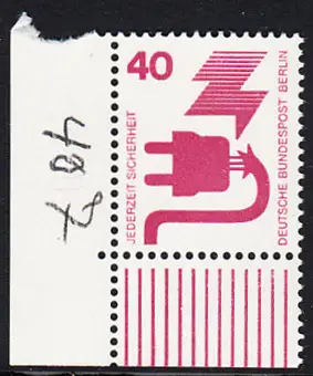 BERLIN 1971 Michel-Nummer 407 postfrisch EINZELMARKE ECKRAND unten links - Unfallverhütung: Defekter Stecker