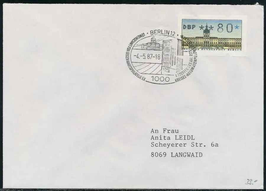 080 Pfg Wert aus der ATM-Ausgabe von 1987, FDC, auf normalem Brief