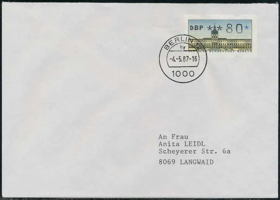 080 Pfg Wert aus der ATM-Ausgabe von 1987, FDC, auf normalem Brief