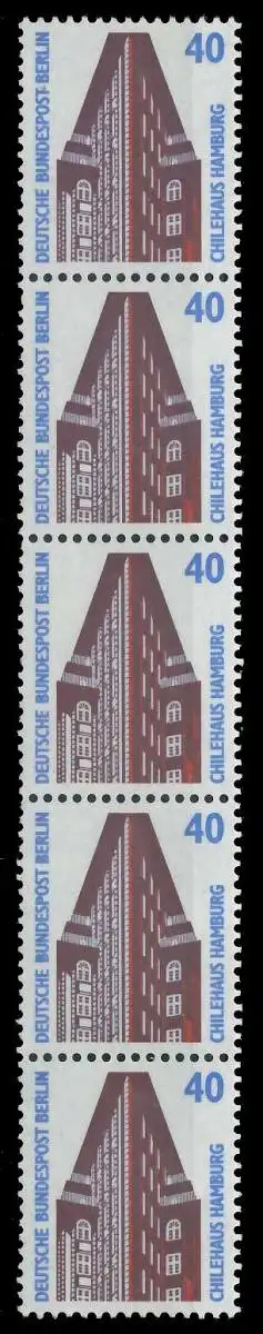 040 Pfg Wert aus der Berlin-Dauerserienausgabe Sehenswürdigkeiten als 5er Streifen, ein Wert mit rückseitiger Nummer 030