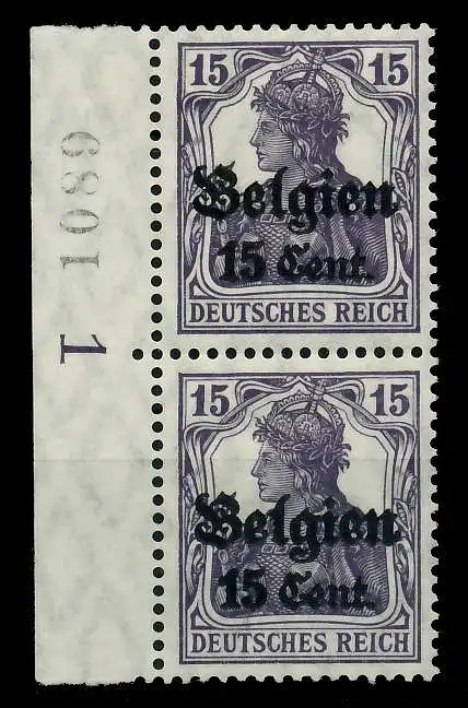 15 Cent auf 15 Pfg Wert aus der Aufdruckausgabe Landespost in Belgien (Generalgouvernement) auf den Freimarken des deutschen Reiches (Germania 1916/1918), mit kurzem Aufdruck, Seitenrandstück mit Nummer