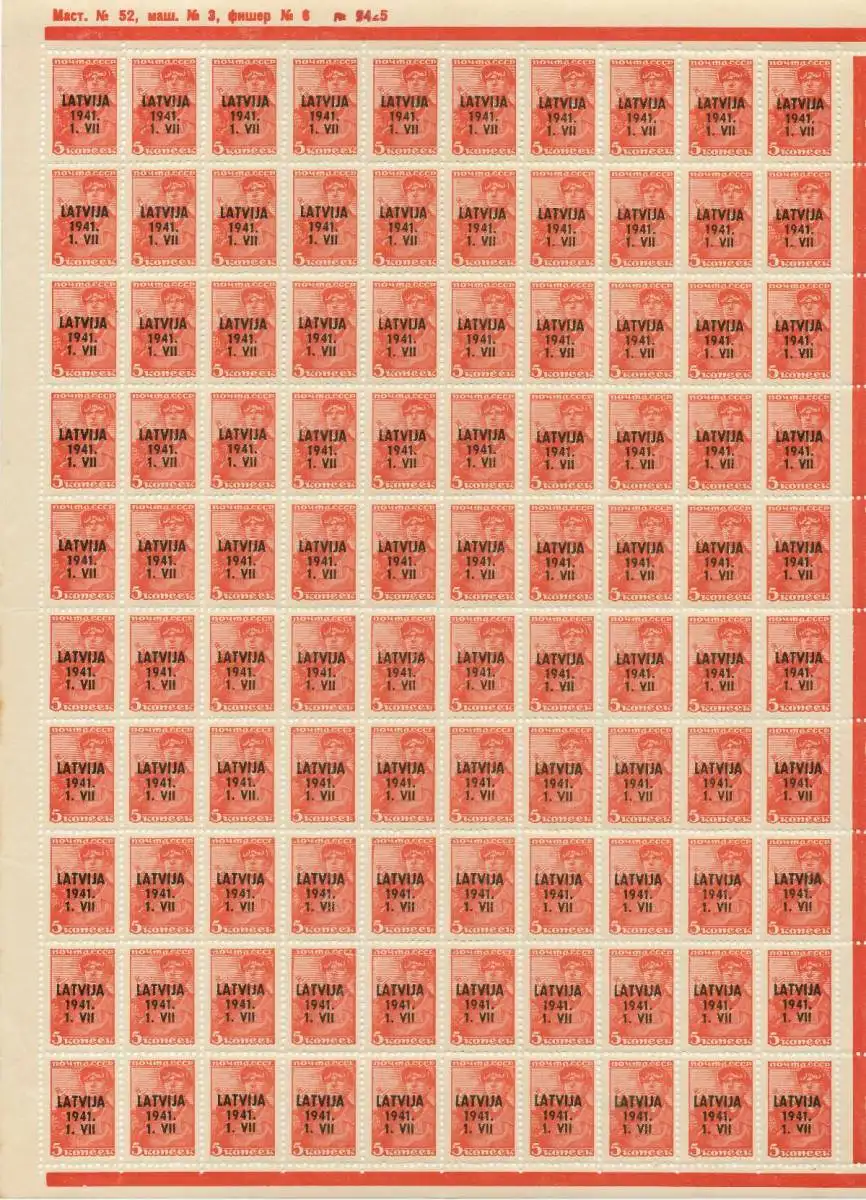5K Wert aus der Aufdruckausgabe Lettland (Landespost während der deutschen Besetzung) im kpl. 100er Bogen, Oberrandlinie teilweise gebrochen. Bogen jeweils senkrecht und waagerecht mittig gefaltet.