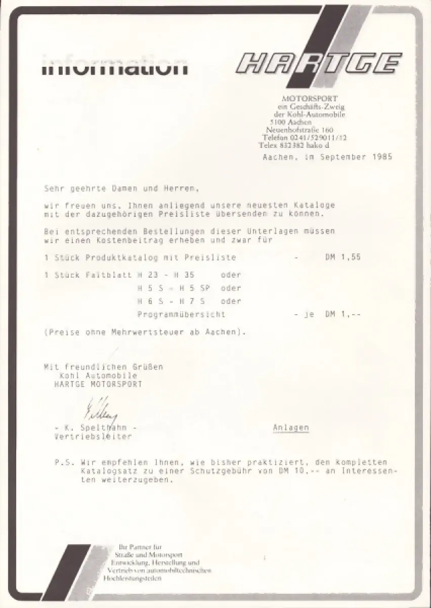 Anschreiben, Partner-Liste, Preisliste Motorsport Prospekt 34 Seiten Programm 6 Seiten H 23 / 26 / 28 / 35 Prospekt 8 Seiten H 5S / 5SP Prospekt 6 Seiten und H 6S / 6SP / 7S Prospekt 6 Seiten Guter Zustand