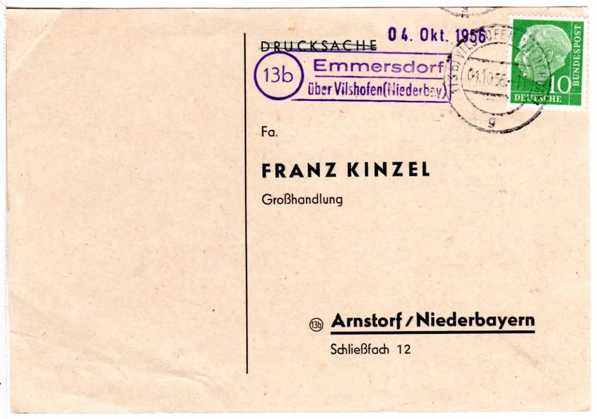 BRD 1956, Landpost Stpl. 13b EMMERSDORF über Vilshofen auf Karte m. 10 Pf.