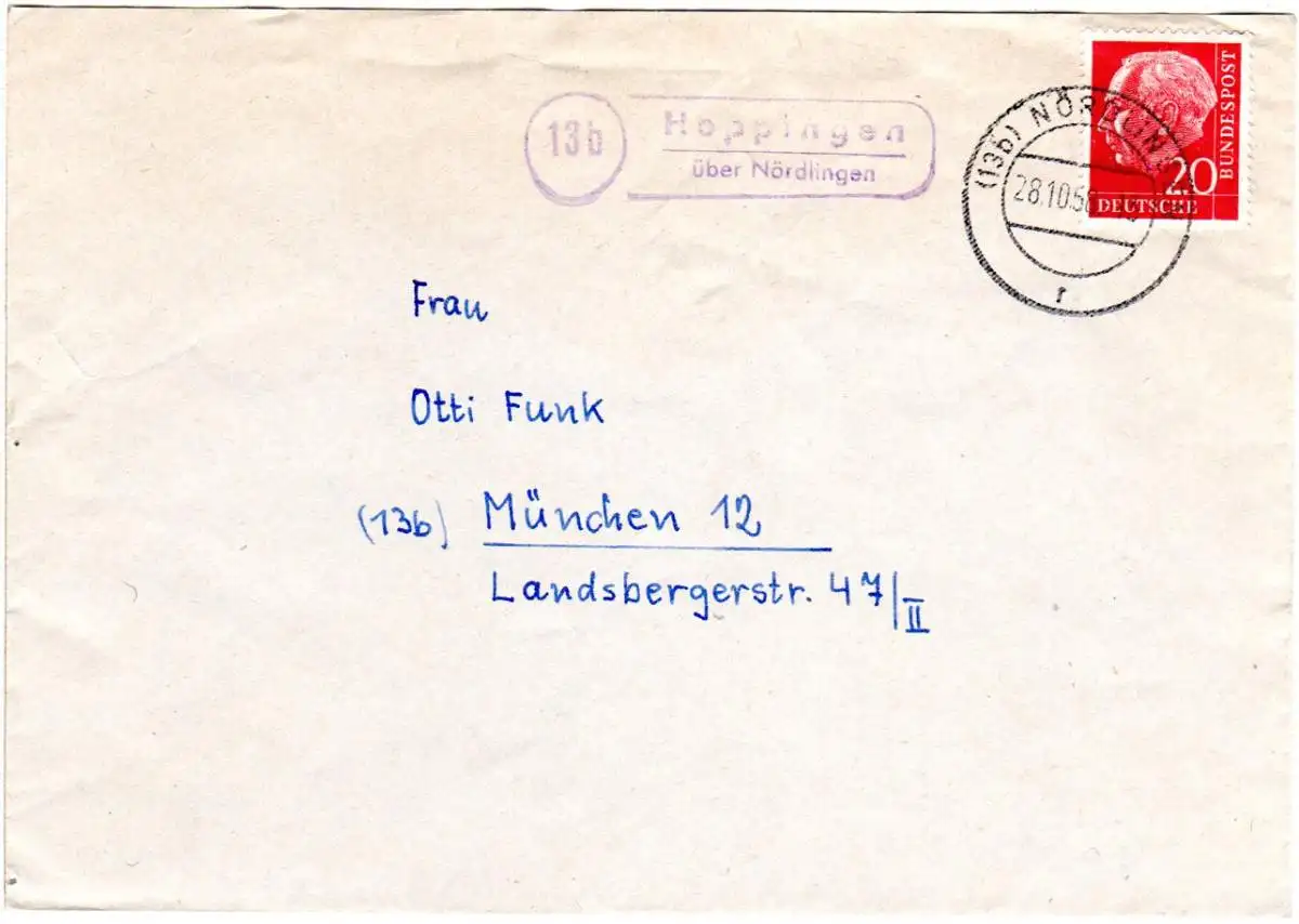BRD 1958, Landpost Stpl. 13b HOPPINGEN über Nördlingen auf Brief m. 20 Pf.