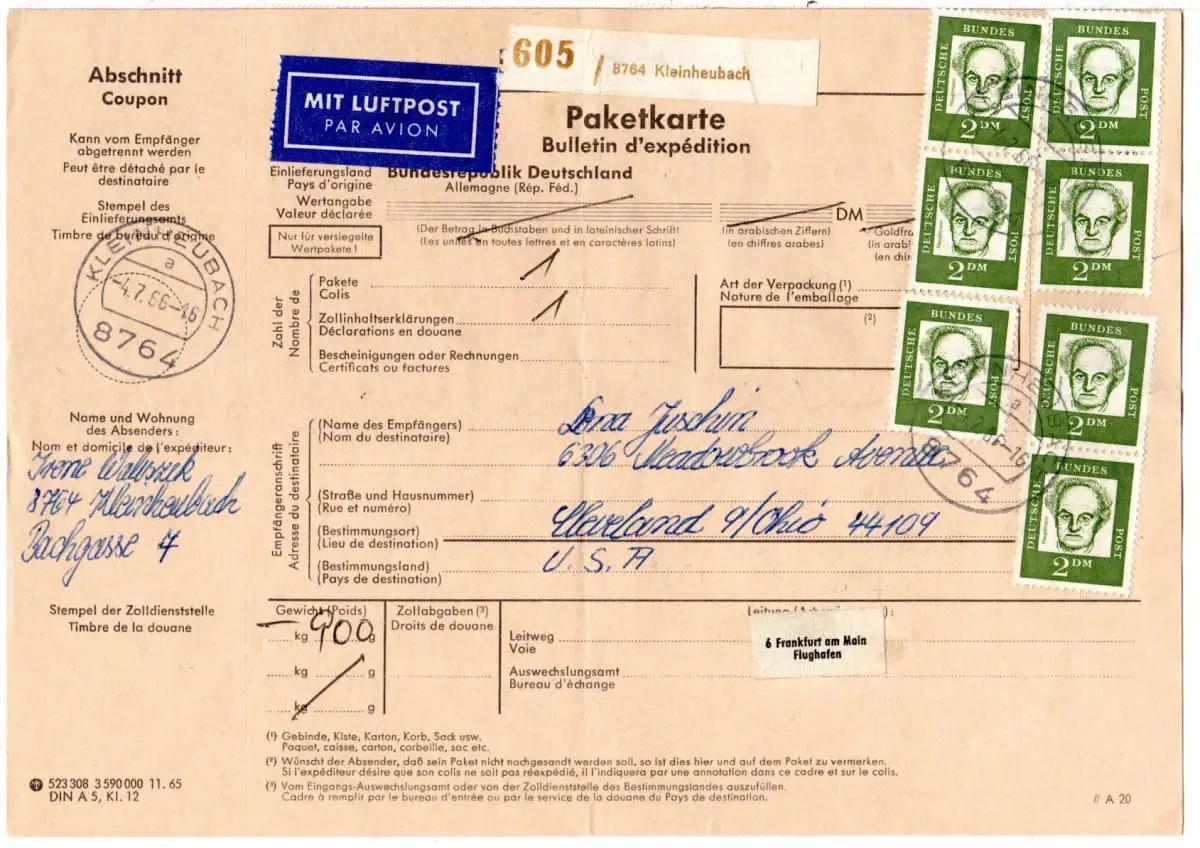 BRD 1966, reine MeF 7x2 M. auf Luftpost Paketkarte v. Kleinheubach n. USA