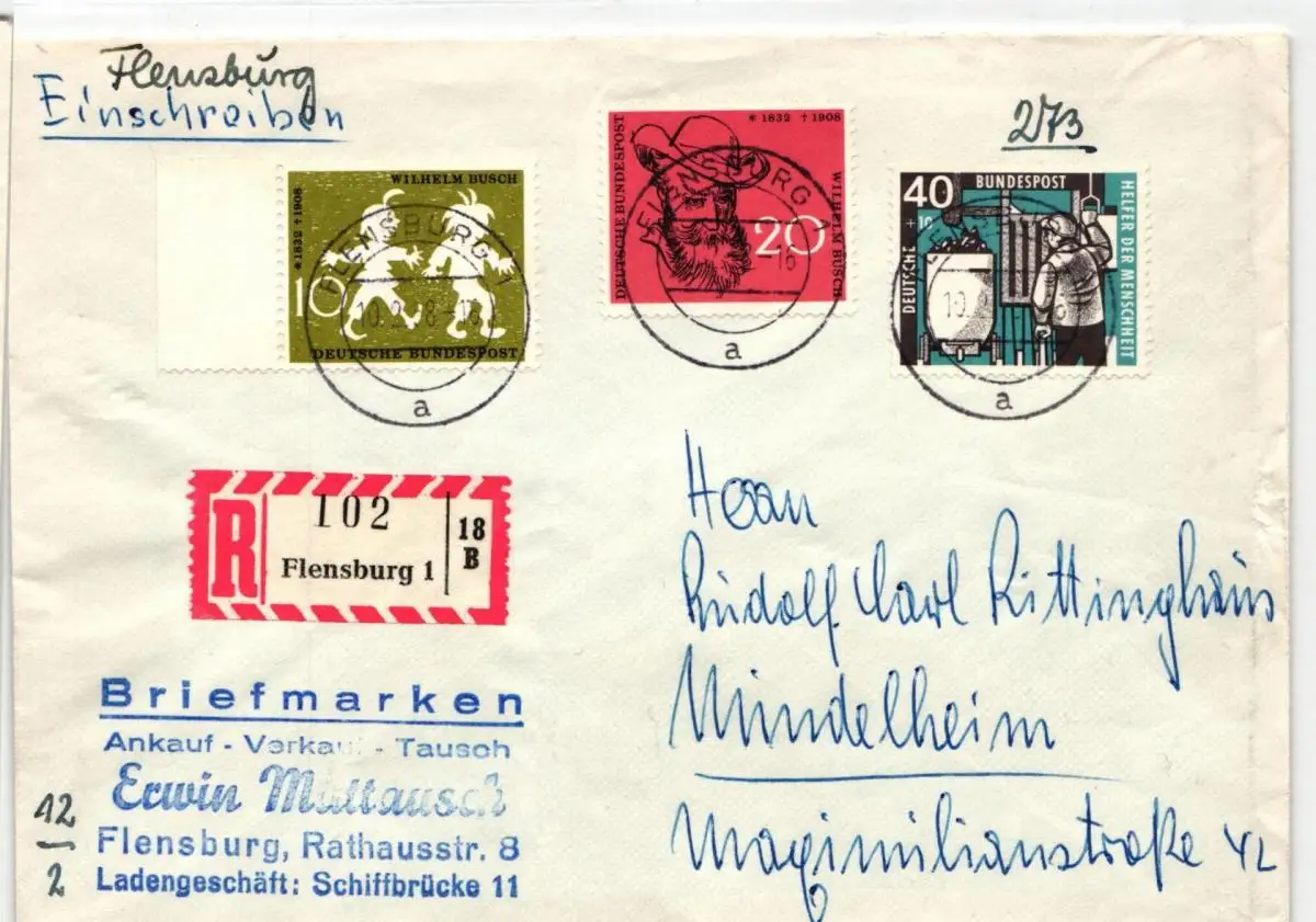 40 Pfenning "Kohlebergbau" vom Eckrand in Kombination mit 10 und 20 Pfenning "Busch" als portogerechtes Einschreiben von Flensburg am 10.2.58 nach Mindelheim gelaufen.