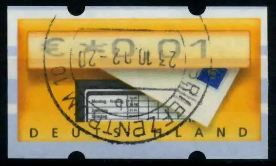 0,01 Euro Wert aus der ATM Ausgabe von 2002, mit Briefkastenlogo, Werteindruck 28mm lang